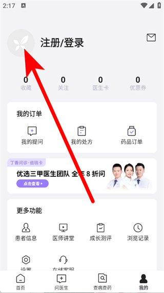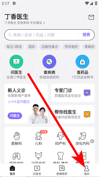 1、打開丁香醫(yī)生,點(diǎn)擊底部導(dǎo)航欄我的,進(jìn)入個(gè)人頁面。