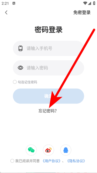 2、在密碼登錄頁(yè)面,點(diǎn)擊忘記密碼,進(jìn)入忘記密碼頁(yè)面。