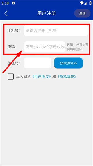 4、隨后我們可以在用戶注冊(cè)頁面,填寫手機(jī)號(hào)和密碼。