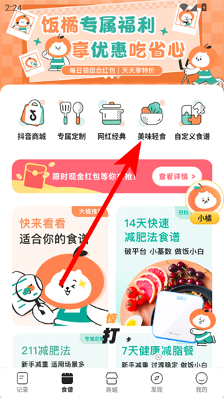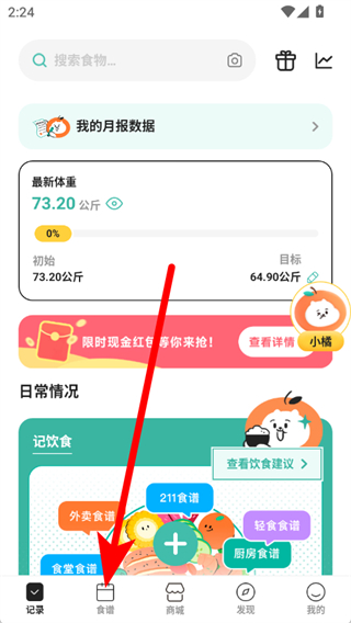 1、打開飯橘減肥,點(diǎn)擊底部食譜,進(jìn)入食譜頁面。