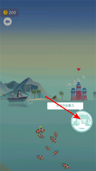 1、在釣魚游戲中,點(diǎn)擊拋竿按鈕開始釣魚,這是開啟釣魚流程的關(guān)鍵操作,通過(guò)拋竿可將魚鉤投入水中吸引魚類。