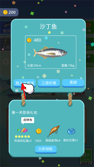 3、釣到沙丁魚等魚類后,點(diǎn)擊放入水族館按鈕,將魚類放入水族館展示,這是資源管理和游戲收集元素的重要環(huán)節(jié)。