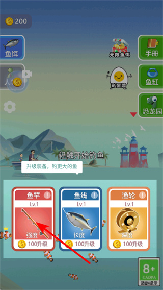 4、點(diǎn)擊魚竿等裝備升級(jí)選項(xiàng),升級(jí)魚竿可提升釣魚的強(qiáng)度,有助于釣起更大更稀有的魚類,推動(dòng)游戲向更高階段發(fā)展。