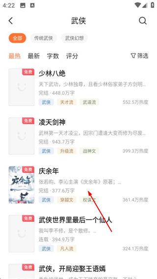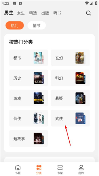 2、在分類頁面,選擇武俠類別,進入武俠小說列表頁面。