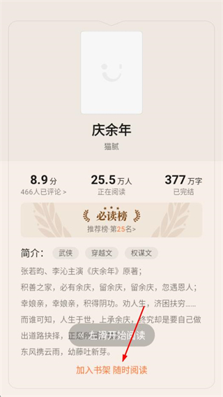 3、在列表頁面,點擊心儀小說如慶余年,進入小說詳情頁面。