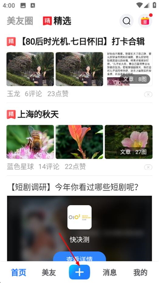 1、打開(kāi)美篇,在首頁(yè)點(diǎn)擊+,彈出創(chuàng)作功能選項(xiàng)列表。