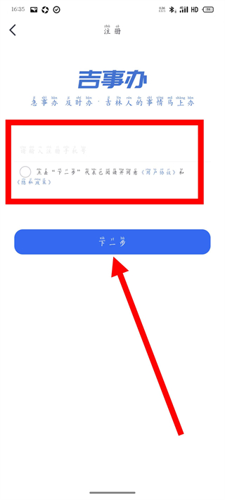 3、填寫注冊信息,勾選吉事辦相關(guān)用戶協(xié)議后,點(diǎn)擊下一步。