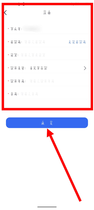 4、完善賬號(hào)、密碼、證件類型及號(hào)碼等信息后,點(diǎn)擊提交,完成賬號(hào)注冊。