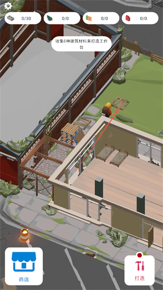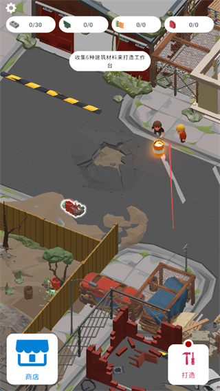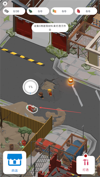 2、根據提示,收集6種建筑材料來打造工作臺,采集不同區(qū)域的資源如車輛、建筑廢墟等,獲取所需材料。