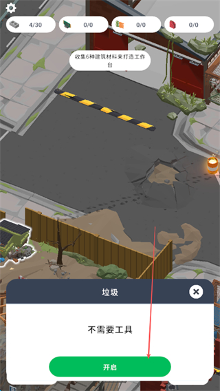 4、遇到垃圾區(qū)域時,點擊開啟按鈕,無需工具即可獲取資源,不斷積累各類資源,為打造建筑和工具奠定基礎。