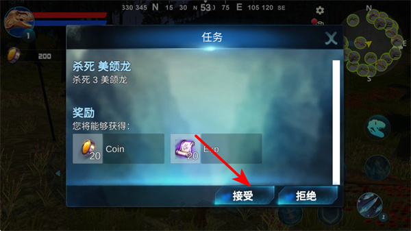 1、在任務(wù)界面,點擊接受按鈕領(lǐng)取殺死美頜龍任務(wù),完成任務(wù)可獲取金幣和經(jīng)驗獎勵,這是快速提升等級。