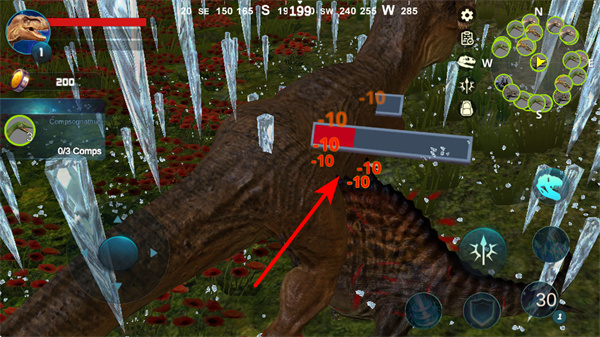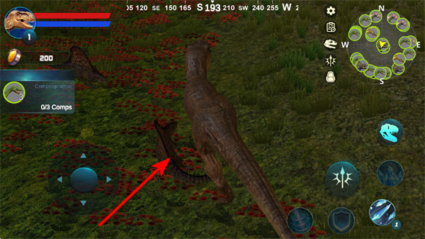 2、操控霸王龍靠近美頜龍等獵物,利用地圖和虛擬搖桿精準(zhǔn)定位目標(biāo),接近獵物是發(fā)起有效攻擊的前提。