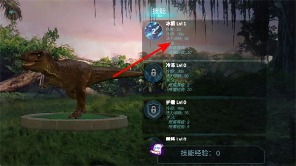 4、進(jìn)入技能界面,解鎖并升級冰精等技能,技能可增強霸王龍的戰(zhàn)斗能力,如冰精能對敵人造成冰凍傷害。