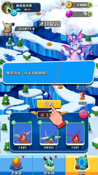 1、在冰封裂谷等場(chǎng)景中,點(diǎn)擊冒險(xiǎn)按鈕開始冒險(xiǎn),選擇出戰(zhàn)的龍陣容如火龍、影翼龍等。