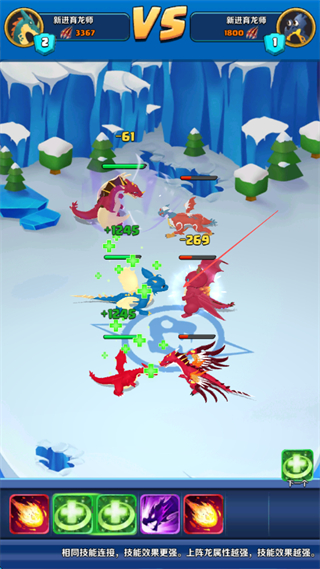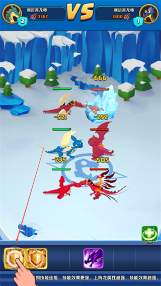 2、戰(zhàn)斗中,點(diǎn)擊下方技能按鈕釋放技能,上方的龍屬性越強(qiáng),技能效果越顯著,以此攻擊敵方龍,削減其血量。