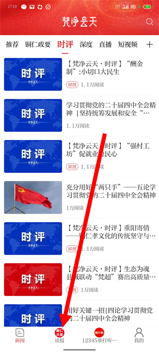 1、打開梵凈云天,點擊底部導(dǎo)航欄讀報,進(jìn)入頁面。