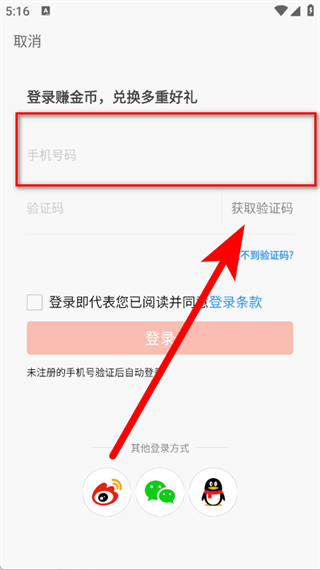 3、在登錄頁面,輸入手機(jī)號碼,點(diǎn)擊獲取驗(yàn)證碼。