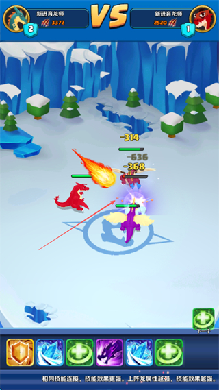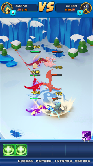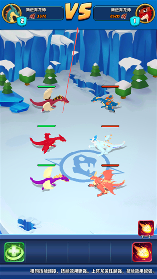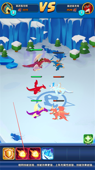 2、點擊下方技能按鈕,相同技能連接使用效果更強,上方龍屬性越強,技能效果越顯著,以此對敵方龍造成傷害或為己方龍?zhí)峁┰鲆妗?
