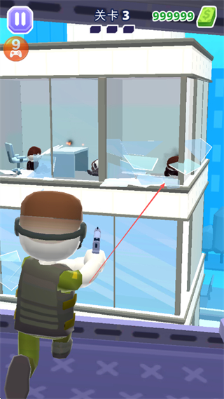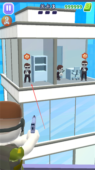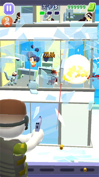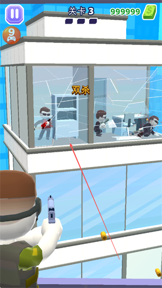1、在關(guān)卡3中,觀察建筑內(nèi)敵人的分布,瞄準(zhǔn)多個敵人的連線路徑,實(shí)現(xiàn)雙殺甚至多殺,高效消滅敵人。