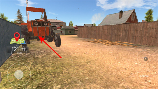 1、在游戲中關(guān)注場景中的橙色拖拉機等物體,結(jié)合地圖距離提示如121,朝著方向移動,是任務(wù)互動點資源獲取點。