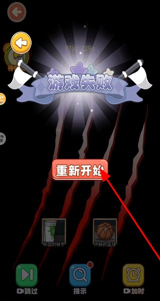 3、若因未找齊懸疑點(diǎn)導(dǎo)致游戲失敗,點(diǎn)擊重新開(kāi)始按鈕,再次發(fā)起挑戰(zhàn),繼續(xù)專注查找異常,努力爭(zhēng)取通關(guān)。