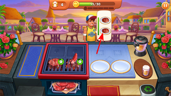 2、牛排烹飪完成后,點擊餐品進行上菜,上菜操作是滿足顧客需求、獲取金幣的關(guān)鍵步驟,需及時為顧客送達美味餐品。