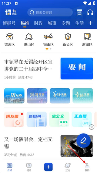 1、打開(kāi)無(wú)錫博報(bào),在首頁(yè)點(diǎn)擊我的,進(jìn)入個(gè)人中心頁(yè)面。
