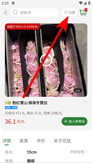 4、在商品詳情頁,點擊收藏按鈕,完成鮮花商品收藏。