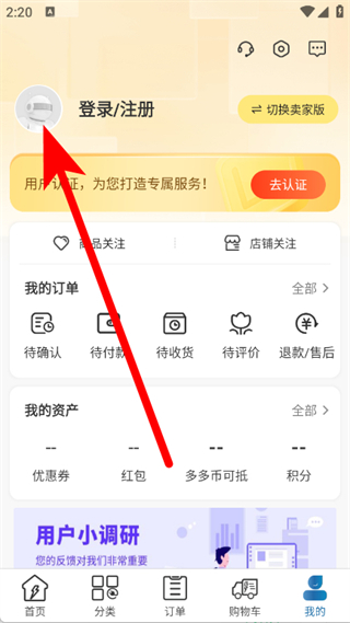 2、在個人頁面,點擊登錄注冊區(qū)域,進入登錄頁面。