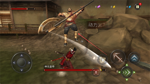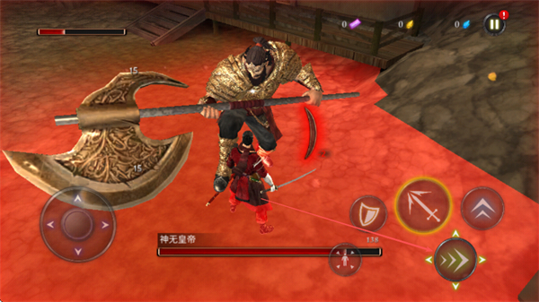 1、操控左側(cè)虛擬搖桿移動角色,躲避神無皇帝的巨斧攻擊,同時(shí)點(diǎn)擊右側(cè)攻擊按鈕發(fā)起進(jìn)攻,消耗其血量。