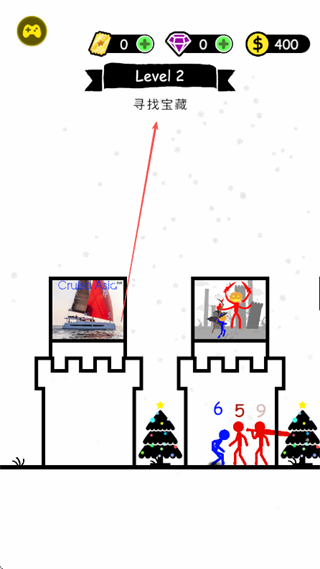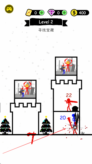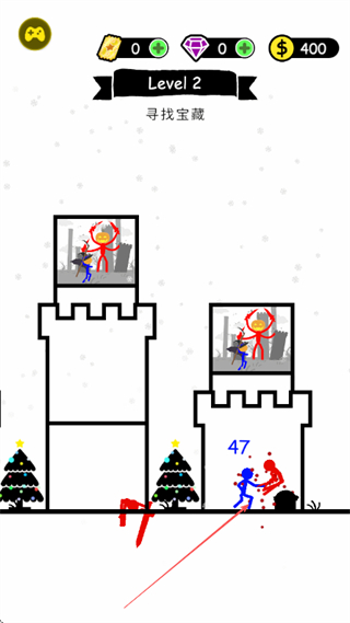1、在Level2中,目標(biāo)是尋找寶藏,操控藍(lán)色火柴人,與紅色敵人戰(zhàn)斗。