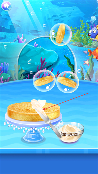 1、通過點擊泡泡,擊破泡泡獲取到蛋糕胚放置到托盤上去。