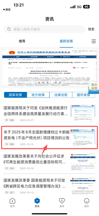 3、在最新政策列表頁(yè)面,點(diǎn)擊關(guān)于2025年8月全國(guó)新增建檔立卡新能源發(fā)電不含戶用光伏項(xiàng)目情況的公告條目,進(jìn)入政策詳情頁(yè)面。