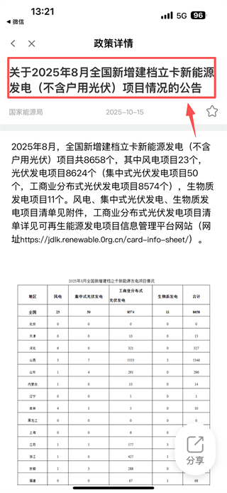 4、在政策詳情頁(yè)面,即可查看該政策的具體內(nèi)容,包括全國(guó)及各地區(qū)新能源發(fā)電項(xiàng)目的數(shù)量分布等信息。