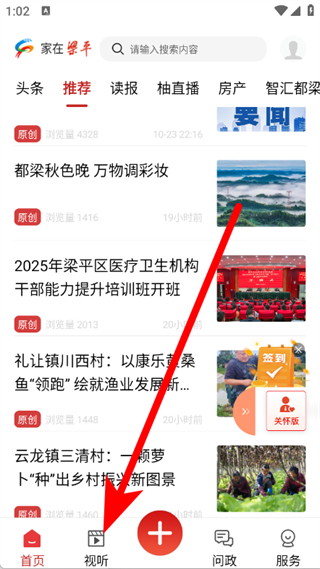 1、打開家在梁平客戶端,點(diǎn)擊底部導(dǎo)航欄視聽。