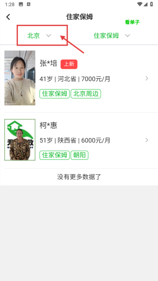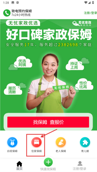 1、打開家政服務(wù)類APP首頁,點擊住家保姆選項,進入住家保姆頁面。