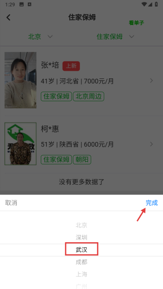2、在住家保姆頁面,點擊城市選擇區(qū)域,將城市切換為武漢,點擊完成。