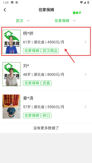3、在武漢住家保姆列表頁面,點擊楊*嬌保姆條目,進入該保姆的詳細信息頁面。