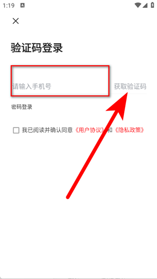 3、在驗(yàn)證碼登錄頁面,輸入手機(jī)號(hào),點(diǎn)擊獲取驗(yàn)證碼。