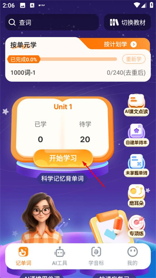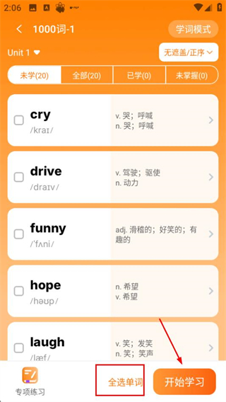 2、在單詞列表頁面,點擊開始學習按鈕,進入單詞學習頁面。