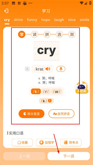 3、在單詞學習頁面,可學習單詞的發(fā)音等,點擊下一詞可學習下一個單詞。
