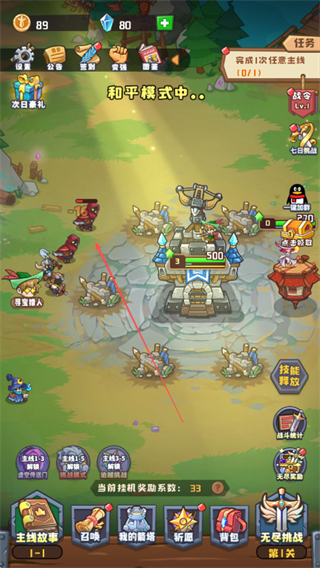 4、布置多種防御塔,利用主線故事、召喚等功能強化防御,在和平模式中積累資源,持續(xù)抵御敵人。
