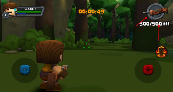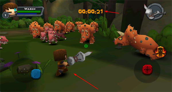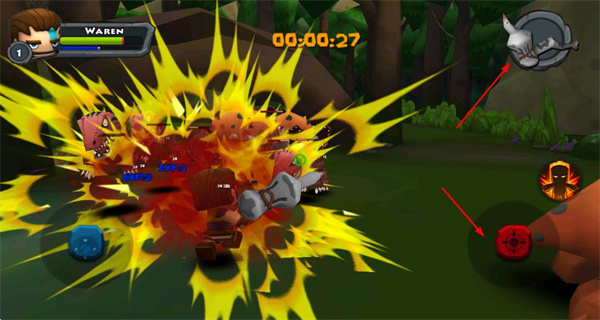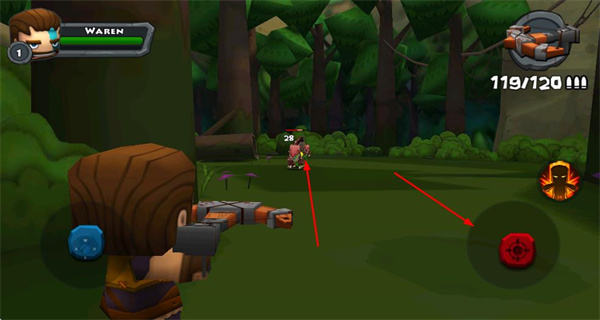 1、進(jìn)入?yún)擦謭鼍昂?,操控角色Warren,點(diǎn)擊右側(cè)紅色攻擊按鈕,瞄準(zhǔn)并射擊怪物如粉色恐龍。