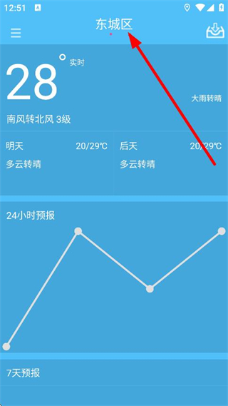 1、在天氣頁(yè)面,點(diǎn)擊頂部東城區(qū),進(jìn)入城市管理頁(yè)面。