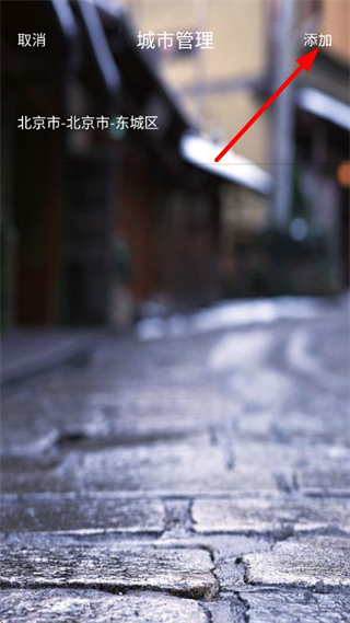 2、在城市管理頁(yè)面,點(diǎn)擊添加,進(jìn)入城市選擇頁(yè)面。