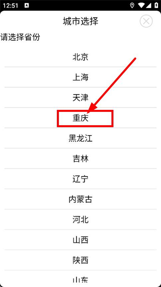 3、在城市選擇頁(yè)面,點(diǎn)擊重慶,選擇該城市。