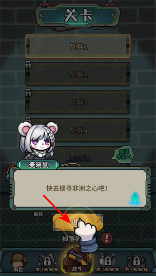 1、在游戲中,點擊進按鈕進入關(guān)卡,這是開啟探索任務(wù)的關(guān)鍵操作,點擊后可參與搜尋非洲之心的關(guān)卡挑戰(zhàn)。