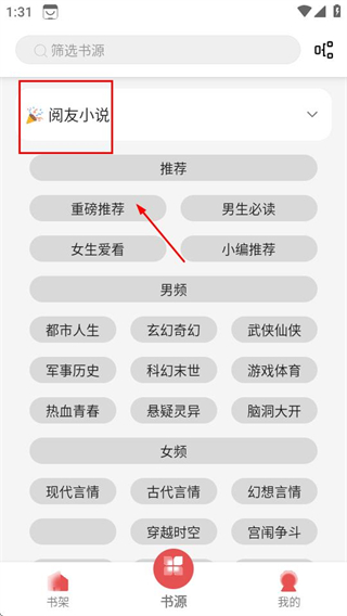 2、在書(shū)源頁(yè)面,選擇閱友小說(shuō)下的重磅推薦分類(lèi),進(jìn)入該頁(yè)面。