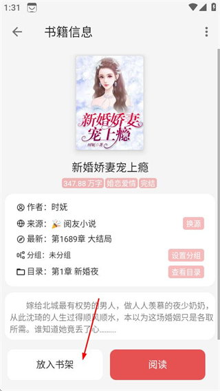 4、在書(shū)籍信息頁(yè)面,點(diǎn)擊放入書(shū)架按鈕,可將該小說(shuō)加入書(shū)架。