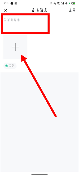 3、進入發(fā)布動態(tài)頁面后,在輸入框中填寫要分享的內(nèi)容,點擊+添加圖片。
